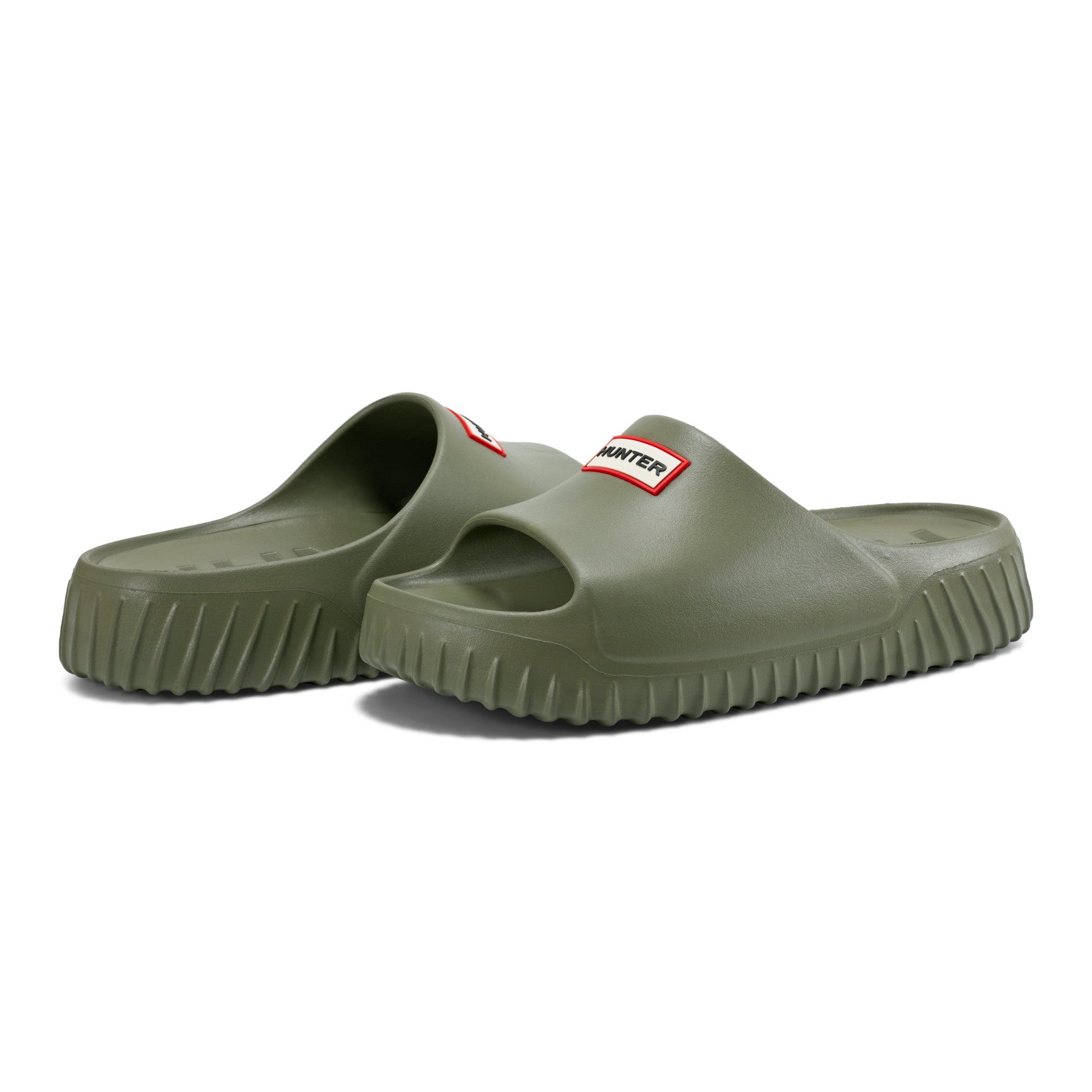 The Finn slide pairs a clean, molded silhouette with a cushioned insert footbed stamped with an embossed Hunter logo underfoot. Lightweight one-piece construction makes it easy to clean and quick to dry, while the wide band sits securely across the foot. A ridged platform outsole delivers sure-footed grip on wet pool decks and sandy paths alike. Purposeful, uncomplicated, and ready for the season ahead.