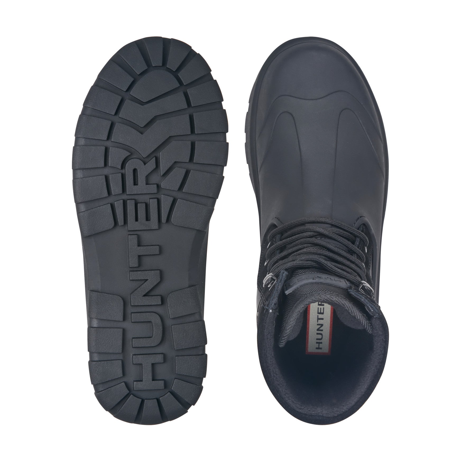 The Men's London Insulated Waterproof Duck Boot is built to seal out the worst of winter and spring alike, with waterproof construction and insulation that keeps feet warm when temperatures drop. A matte rubber lower shell wraps the foot and toe in total weather protection, while the woven fabric and suede upper shaft adds structure and a rugged, utilitarian edge. The chunky lugged outsole bites into wet pavement and uneven ground with confident traction. A secure lace-up closure with reinforced eyelets locks in the fit, and the embossed Hunter branding at the shaft adds a purposeful finishing detail. Whatever the weather, this is a boot designed to perform.