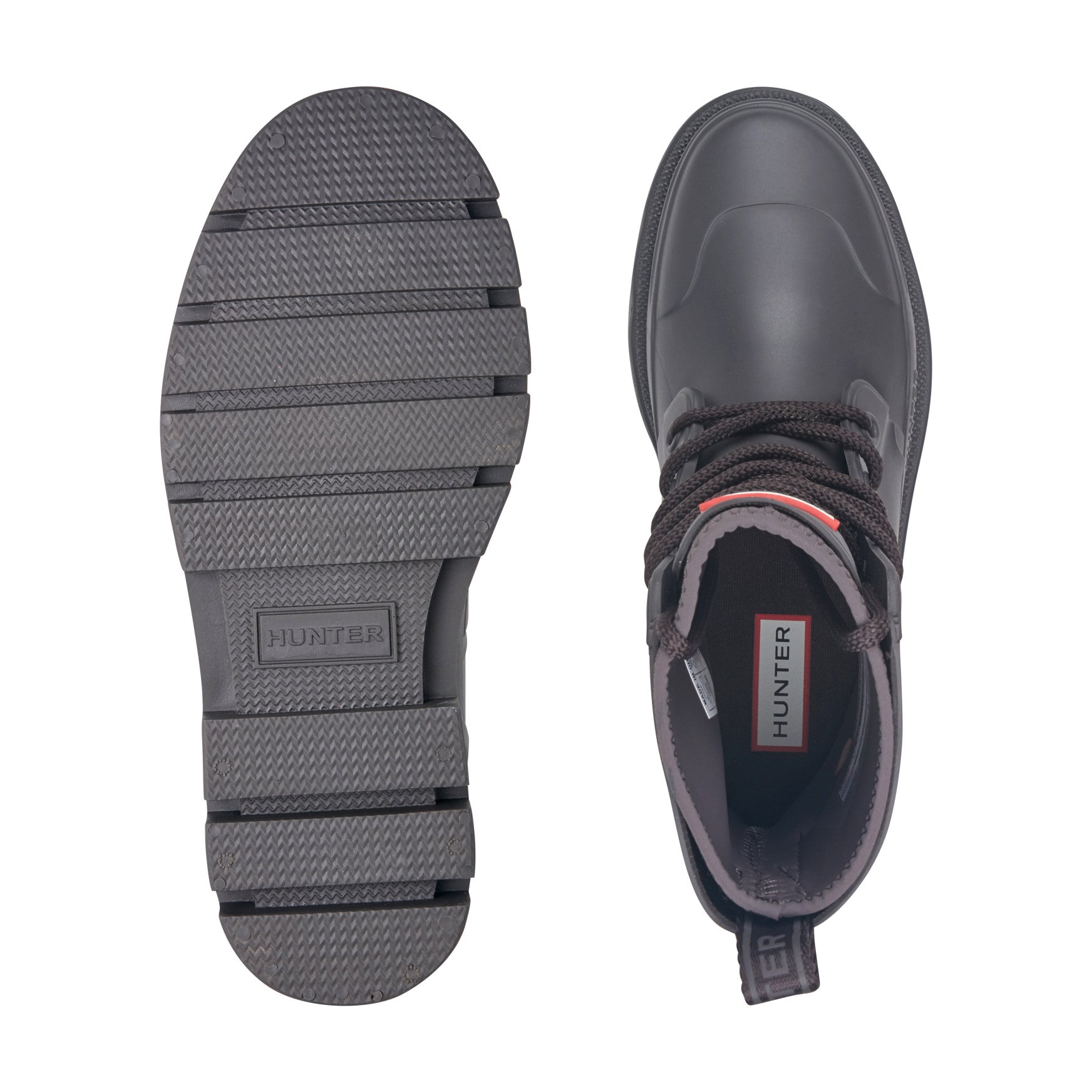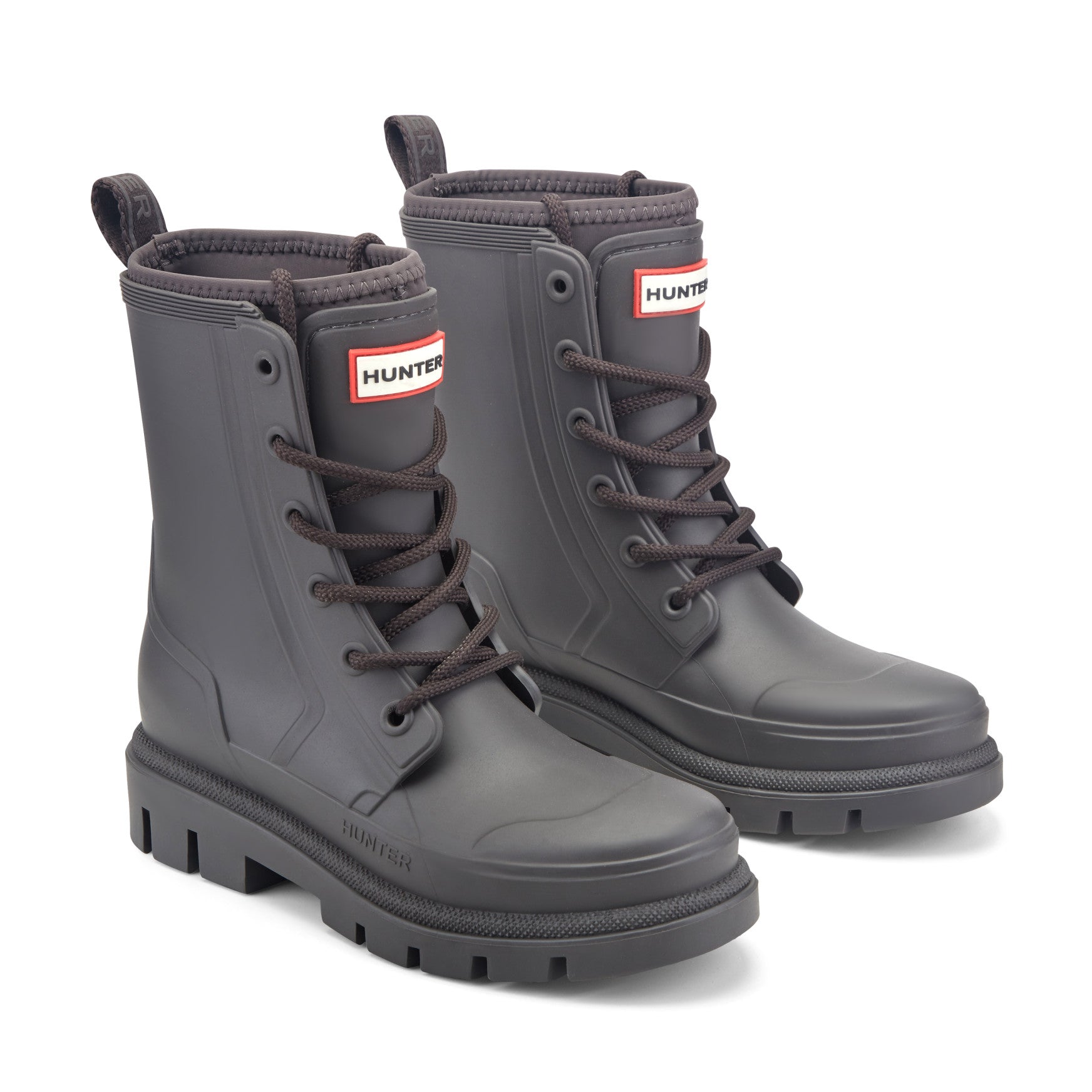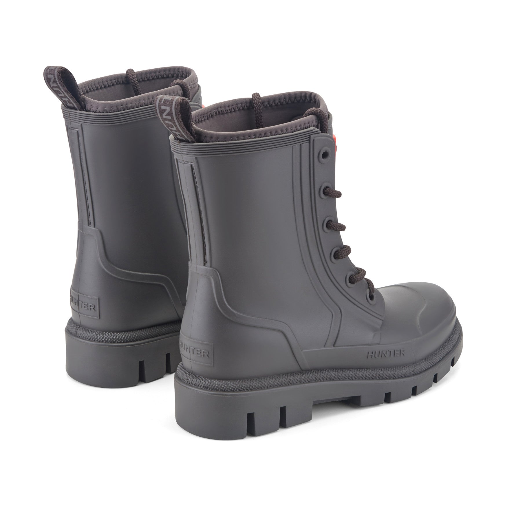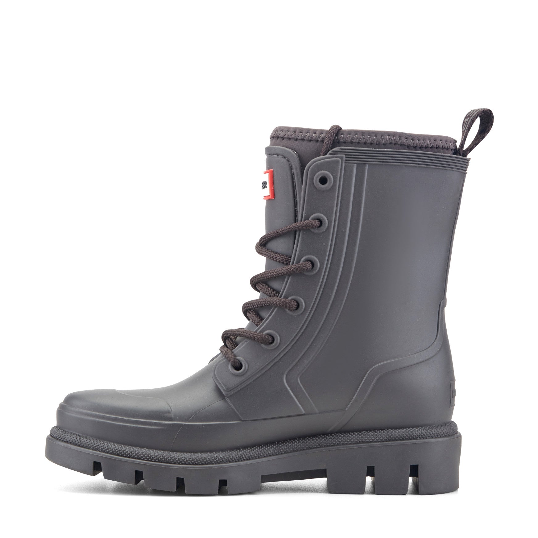 Waterproof and fashion-forward, the Diana is a mid-shaft lace-up rain boot built to seal out spring's most unpredictable downpours. Chunky rope laces thread through reinforced eyelets across a smooth, matte injected upper with sculpted panel detailing, giving you a fully adjustable fit. Inside, the footbed features a comfort molded foam insert, perforated for breathability. A padded collar sits snug at the top of the shaft, and a branded pull tab at the back makes getting in and out effortless. Underfoot, a deep-lugged outsole delivers sure-footed traction on wet pavements and rain-soaked paths alike.