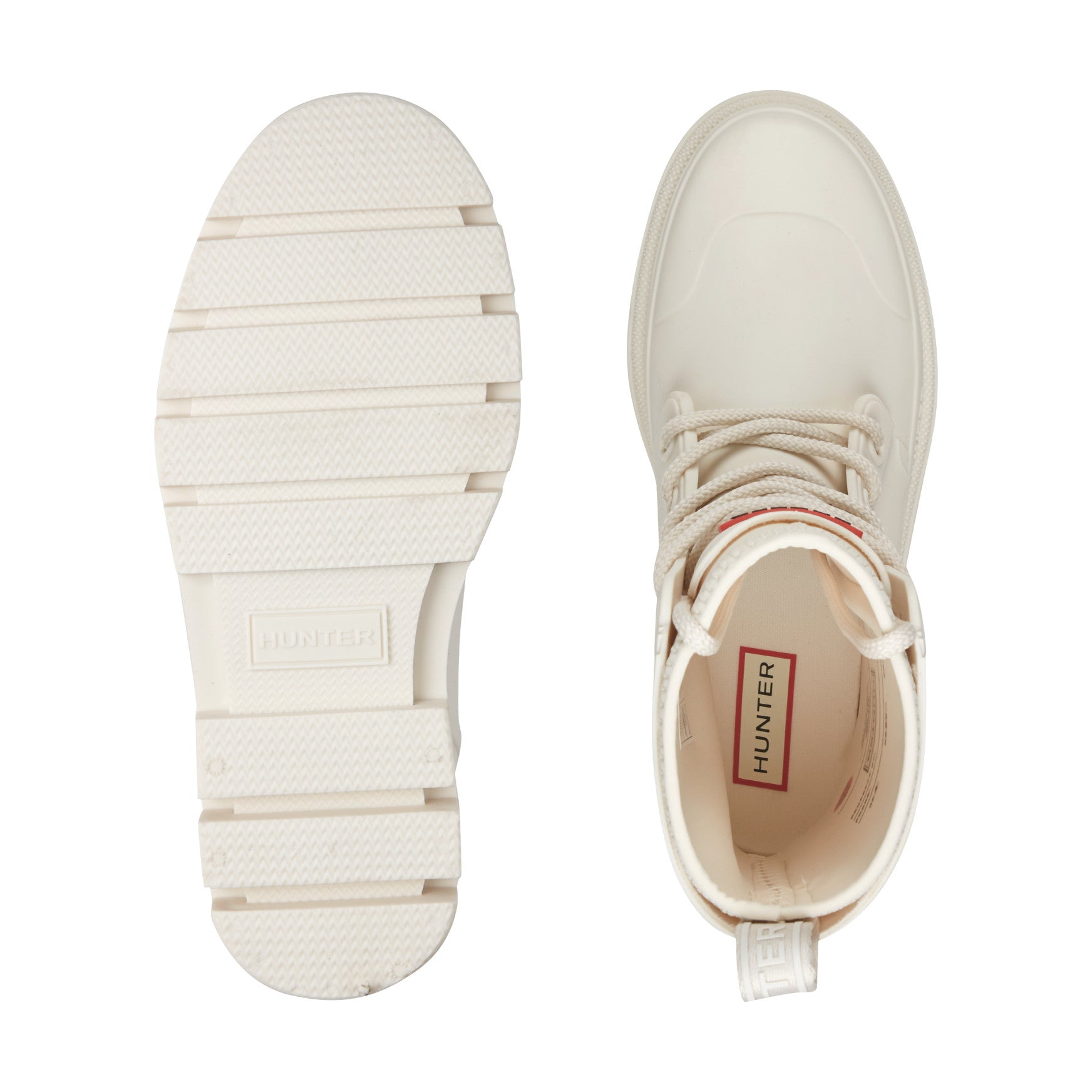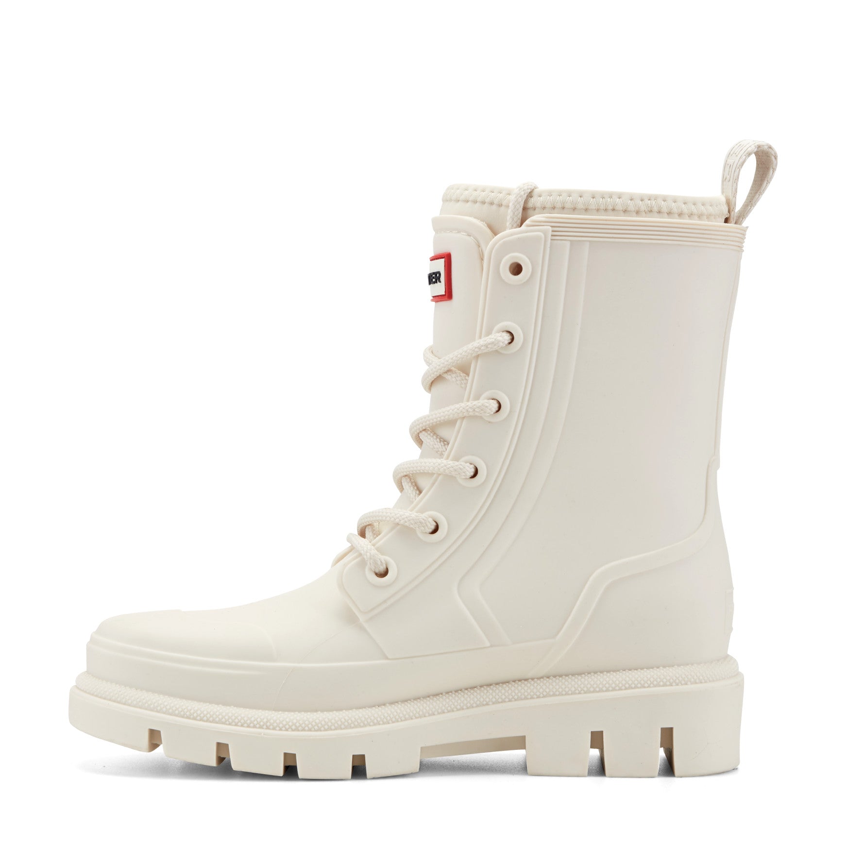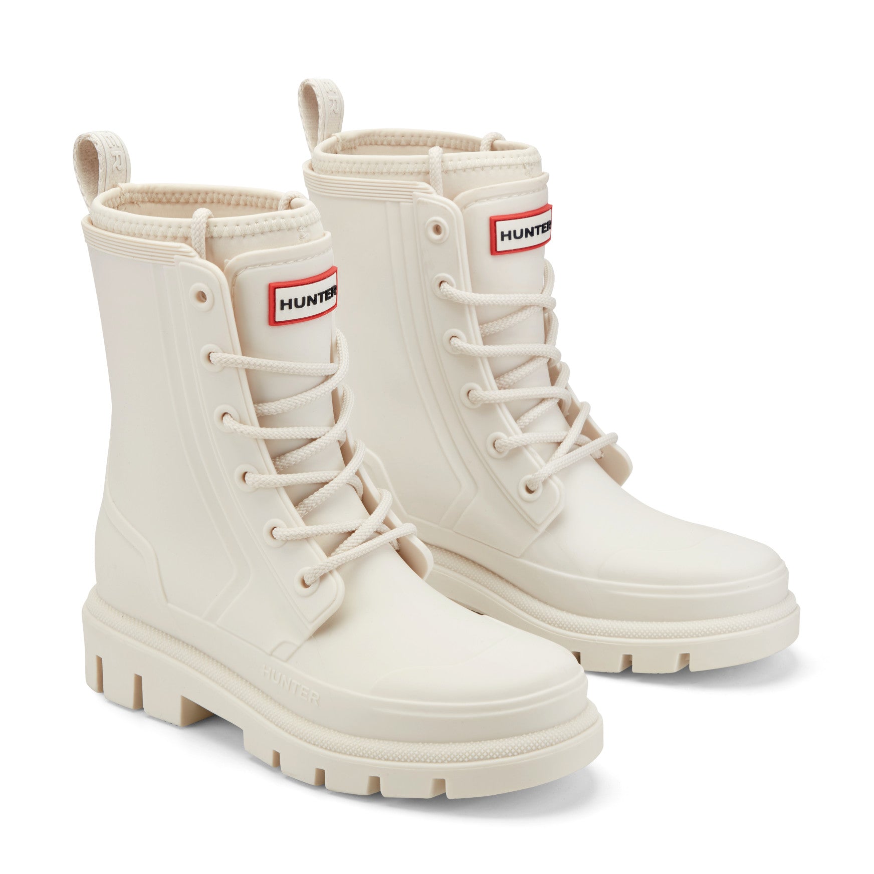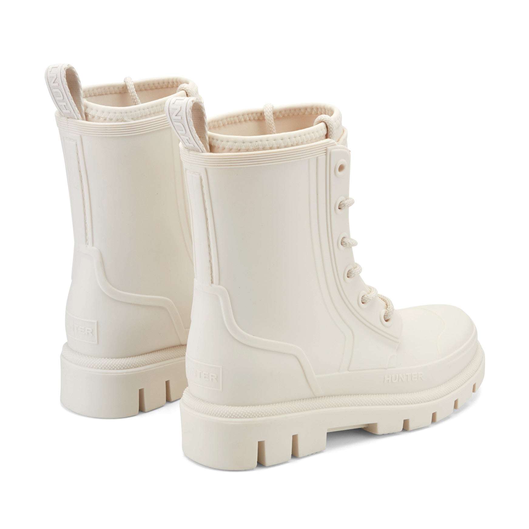 Waterproof and fashion-forward, the Diana is a mid-shaft lace-up rain boot built to seal out spring's most unpredictable downpours. Chunky rope laces thread through reinforced eyelets across a smooth, matte injected upper with sculpted panel detailing, giving you a fully adjustable fit. Inside, the footbed features a comfort molded foam insert, perforated for breathability. A padded collar sits snug at the top of the shaft, and a branded pull tab at the back makes getting in and out effortless. Underfoot, a deep-lugged outsole delivers sure-footed traction on wet pavements and rain-soaked paths alike.