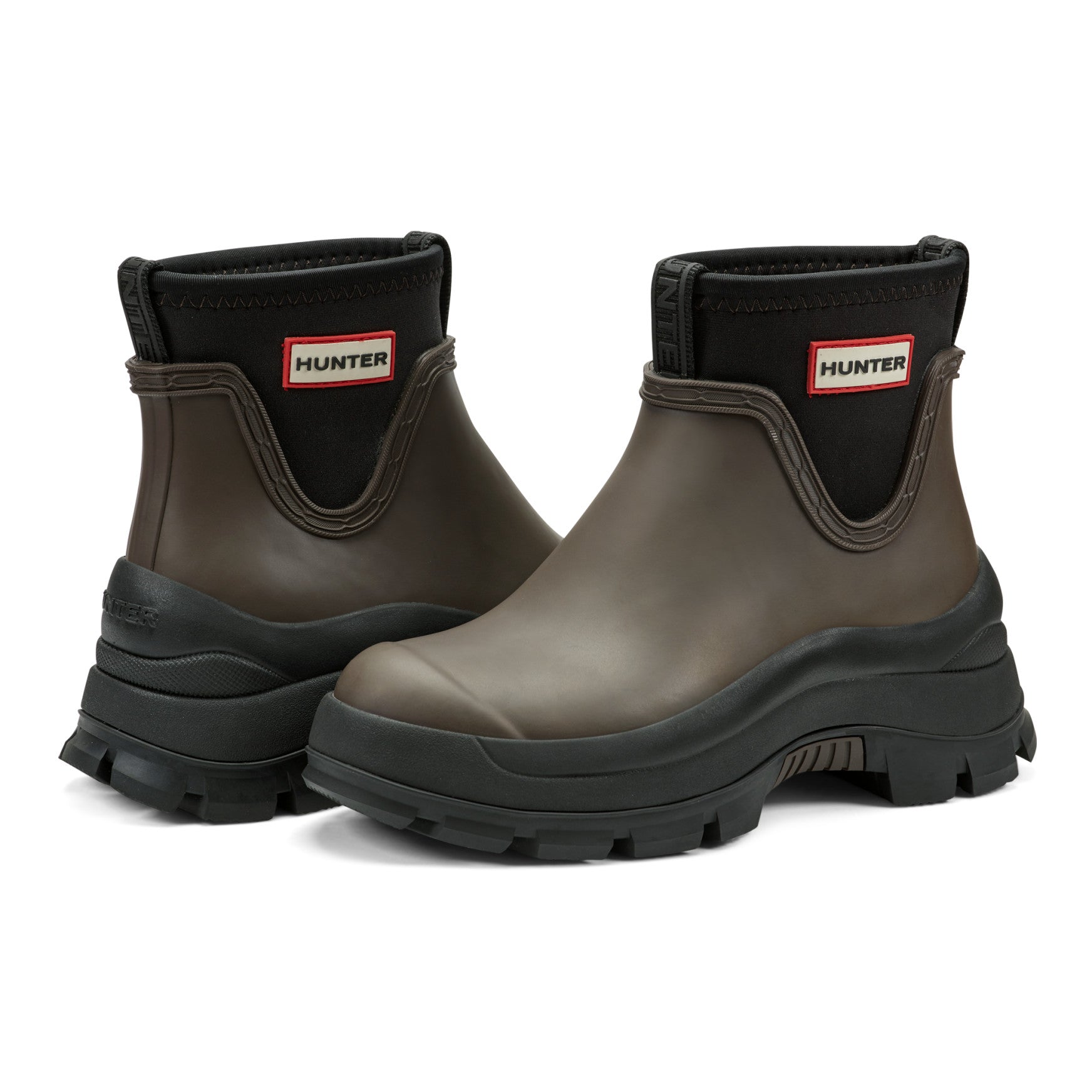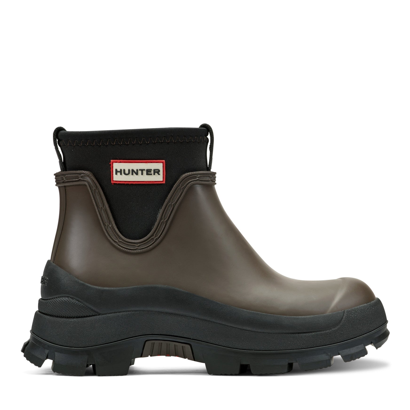 The Eloise is a waterproof ankle bootie with a bold, chunky lug sole that holds its own through downpours and unpredictable skies. A smooth matte rubber upper sits above a substantial layered sole unit, while a stretchy neoprene collar with branded detailing creates a snug, pull-on fit that seals out the rain. The rounded toe and low shaft keep the silhouette clean, and a cushioned footbed adds comfort that lasts from morning errands to evening plans. Built for the world outside, whatever the weather brings.