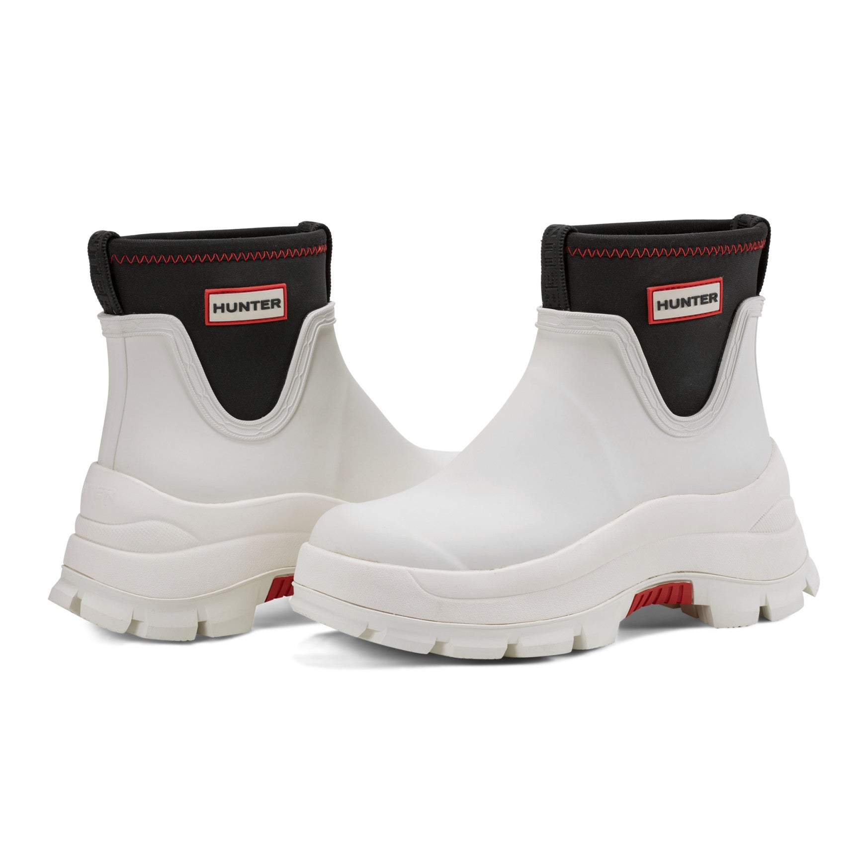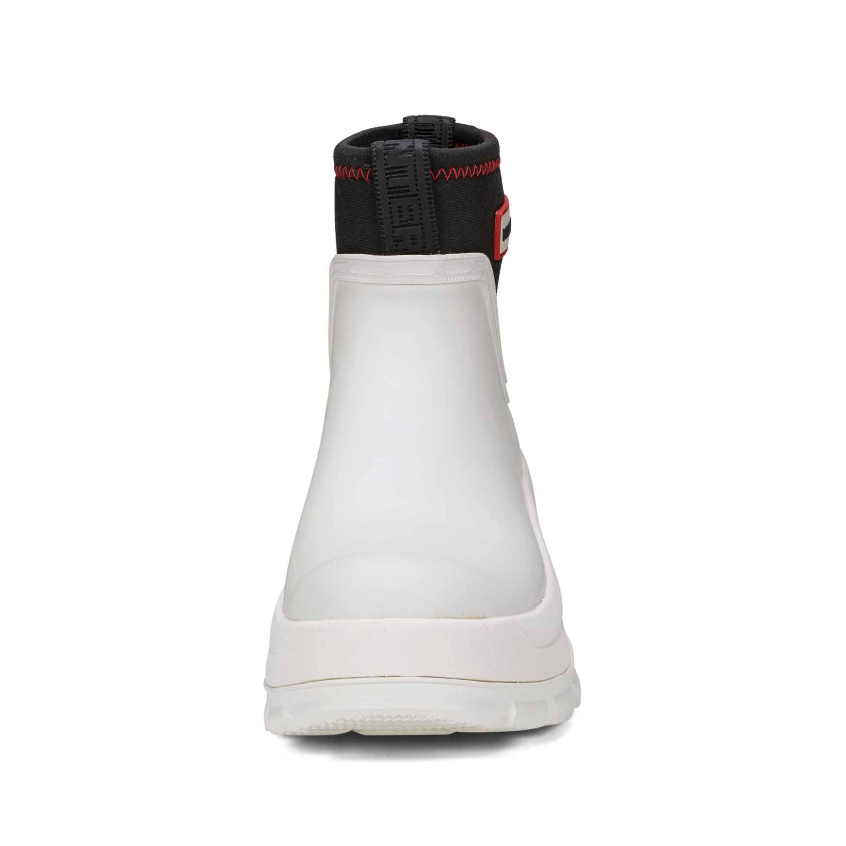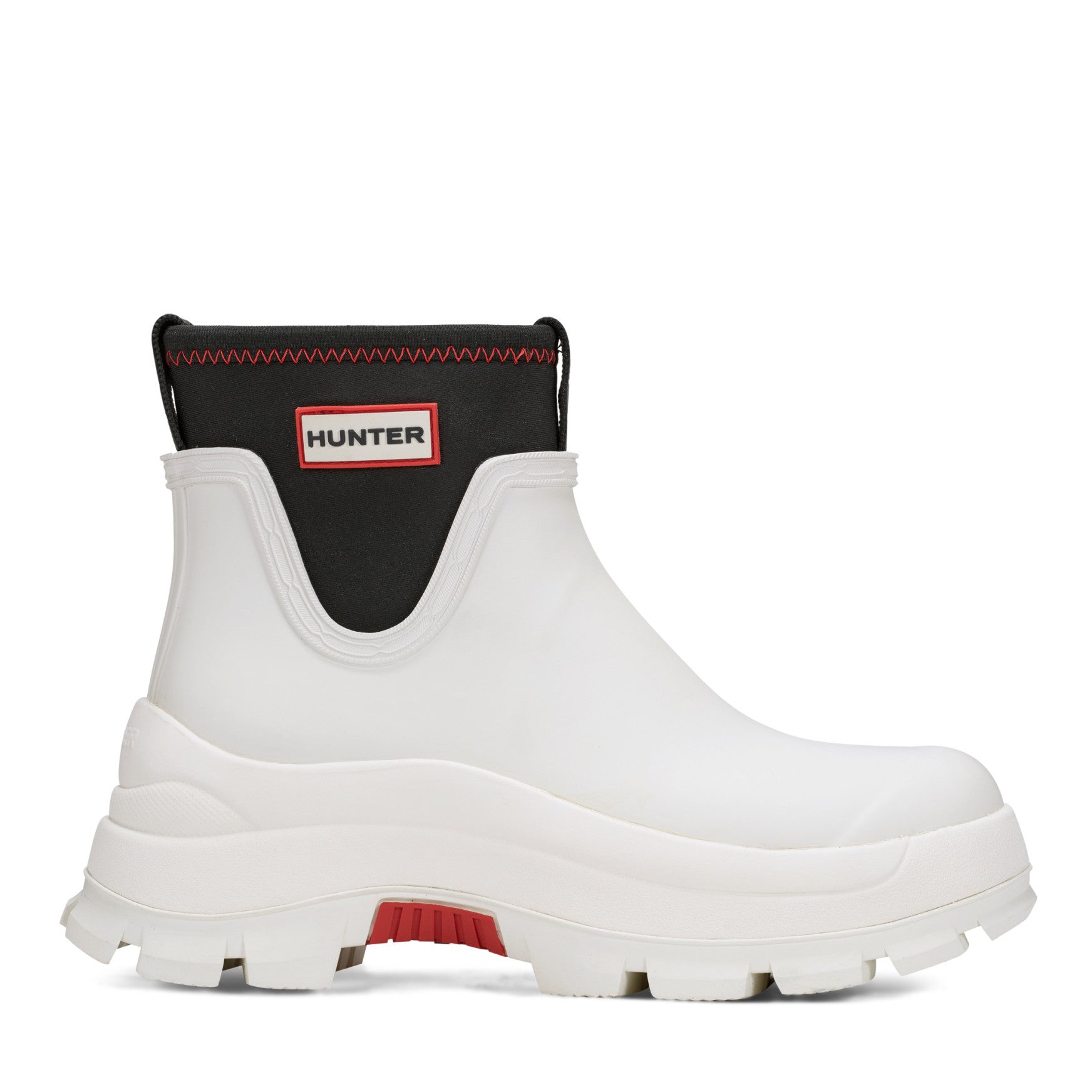 The Eloise is a waterproof ankle bootie with a bold, chunky lug sole that holds its own through downpours and unpredictable skies. A smooth matte rubber upper sits above a substantial layered sole unit, while a stretchy neoprene collar with branded detailing creates a snug, pull-on fit that seals out the rain. The rounded toe and low shaft keep the silhouette clean, and a cushioned footbed adds comfort that lasts from morning errands to evening plans. Built for the world outside, whatever the weather brings.